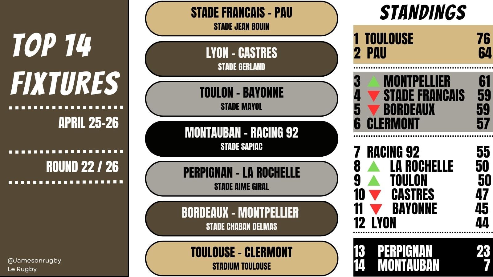 And that was the 21st Top 14 weekend that was. Let’s round off in the usual way with a quick look at next weekend’s fixtures and the current table.