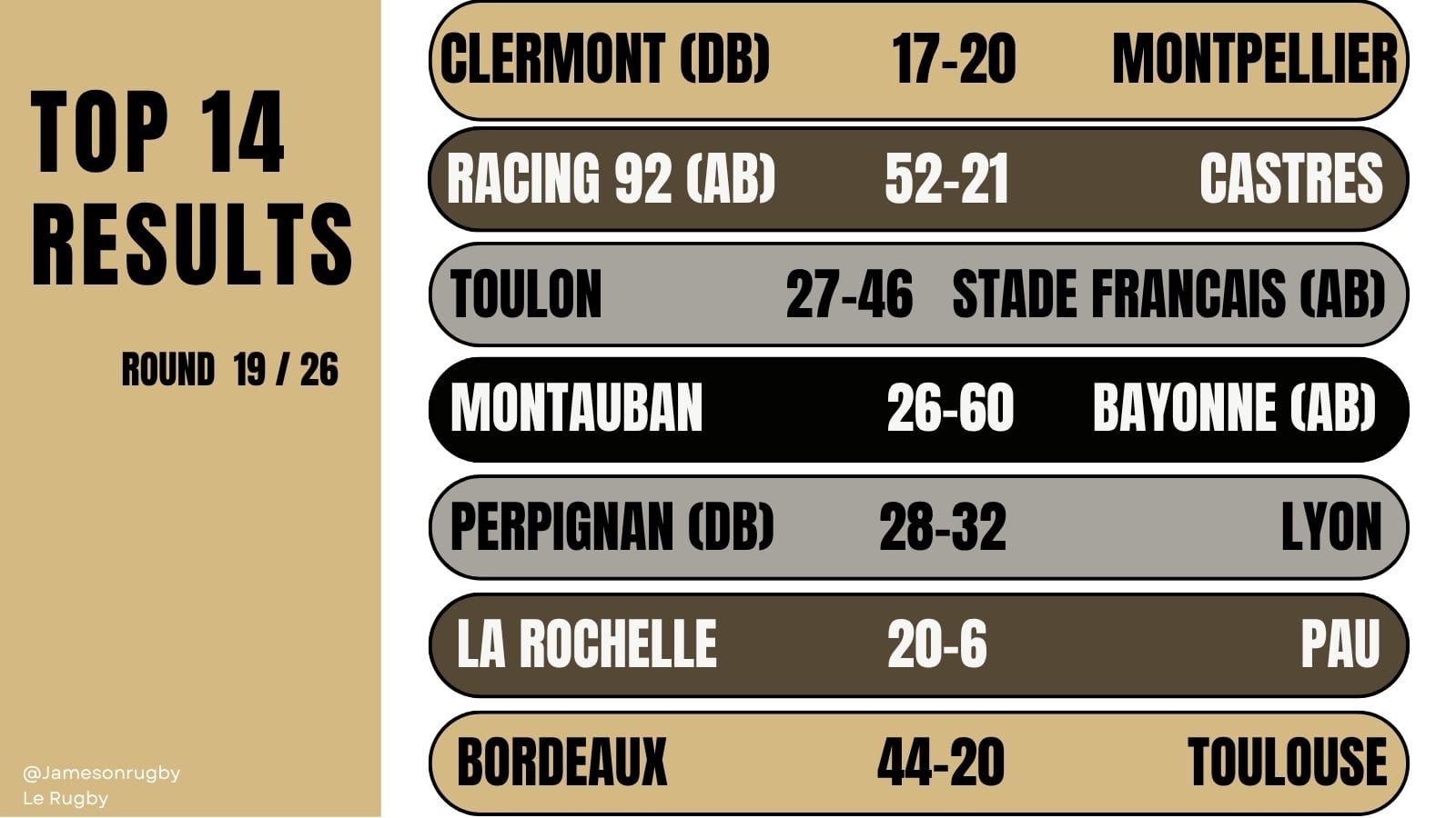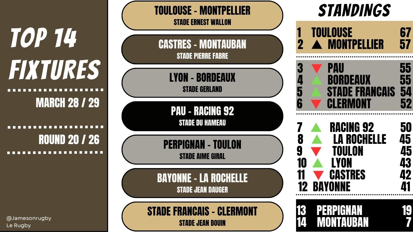 That was the first of two Top 14 weekends after the Six Nations and before the Champions and Challenge Cup round-of-16 and quarter-final fortnight. Bordeaux, Toulouse, Toulon and Castres are still involved in the former, while Stade Francais, Montpellier, La Rochelle, Perpignan, and Pau are prepping for the latter.