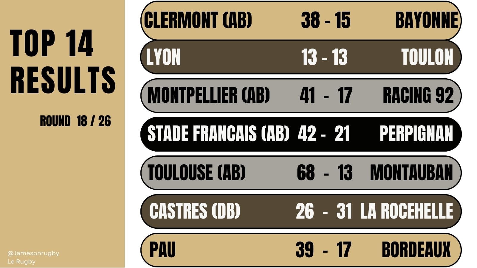 La Rochelle rained on Castres’ planned 120th anniversary parade to bust a long losing streak; what looks on the scoreboard like a dull draw means so much more for Toulon; Pau once again proved they have no intention of making up play-off numbers, doing the double over Bordeaux; while Clermont, Stade Francais and Montpellier all marched up the table.